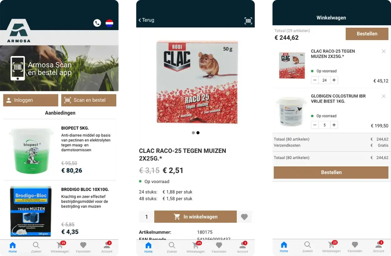 Om de bestelervaring van klanten te optimaliseren, heeft Armosa een real-time gekoppelde scan- en bestelapp geïntroduceerd. De app biedt klanten dezelfde inloggegevens als de webshop, waardoor ze altijd en overal eenvoudig producten kunnen bestellen en actuele informatie hebben. Met deze scan- en bestelapp verhoogt Armosa de efficiëntie voor zichzelf en haar klanten, en biedt het een moderne, gebruiksvriendelijke oplossing voor snelle bestellingen.