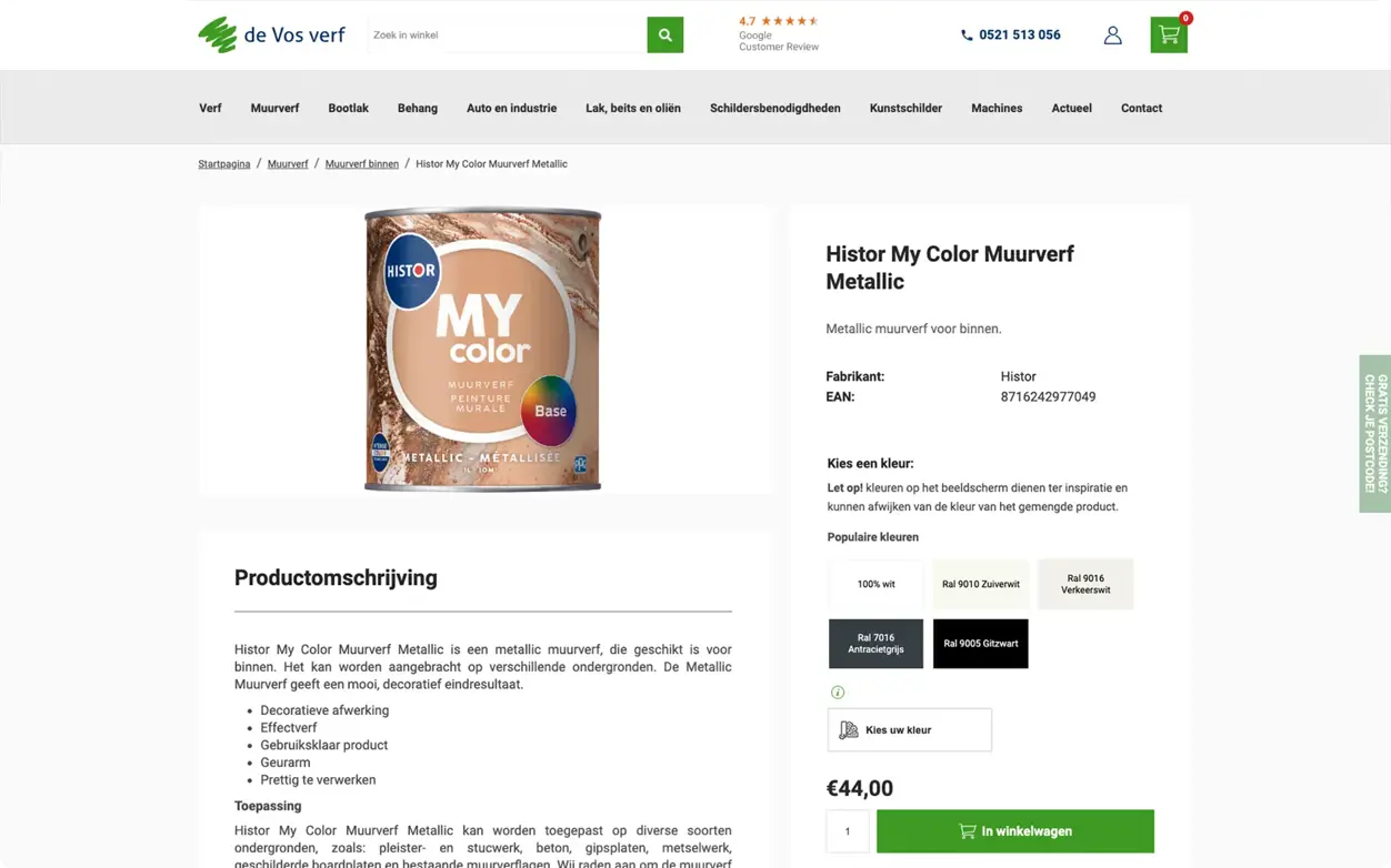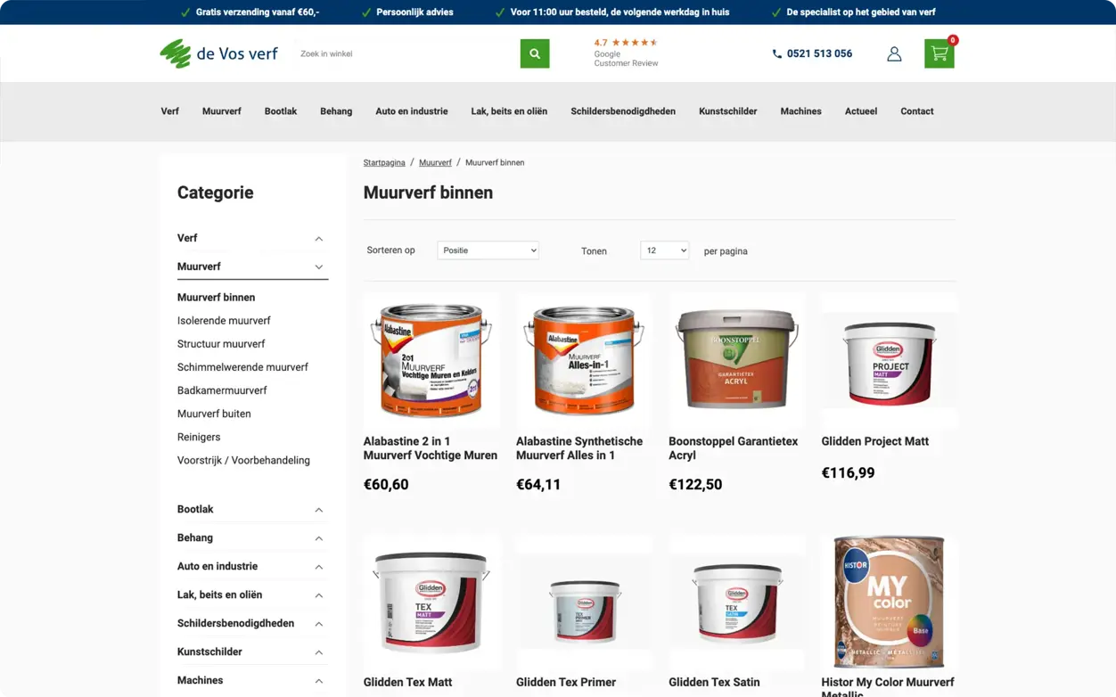 Voor Verfwinkel De Vos hebben we een uitgebreid webshopsysteem ontwikkeld op het veilige en betrouwbare Microsoft .NET platform, dat uitgebreide mogelijkheden biedt voor product- en contentbeheer en is afgestemd op de behoeften van de klant. Door diverse slimme integraties biedt de webshop een optimale klantervaring en effectieve online zichtbaarheid. Dankzij deze integraties en slimme functies beschikt Verfwinkel De Vos over een krachtige en gebruiksvriendelijke webshop die efficiënt werkt voor zowel het bedrijf als de klant.