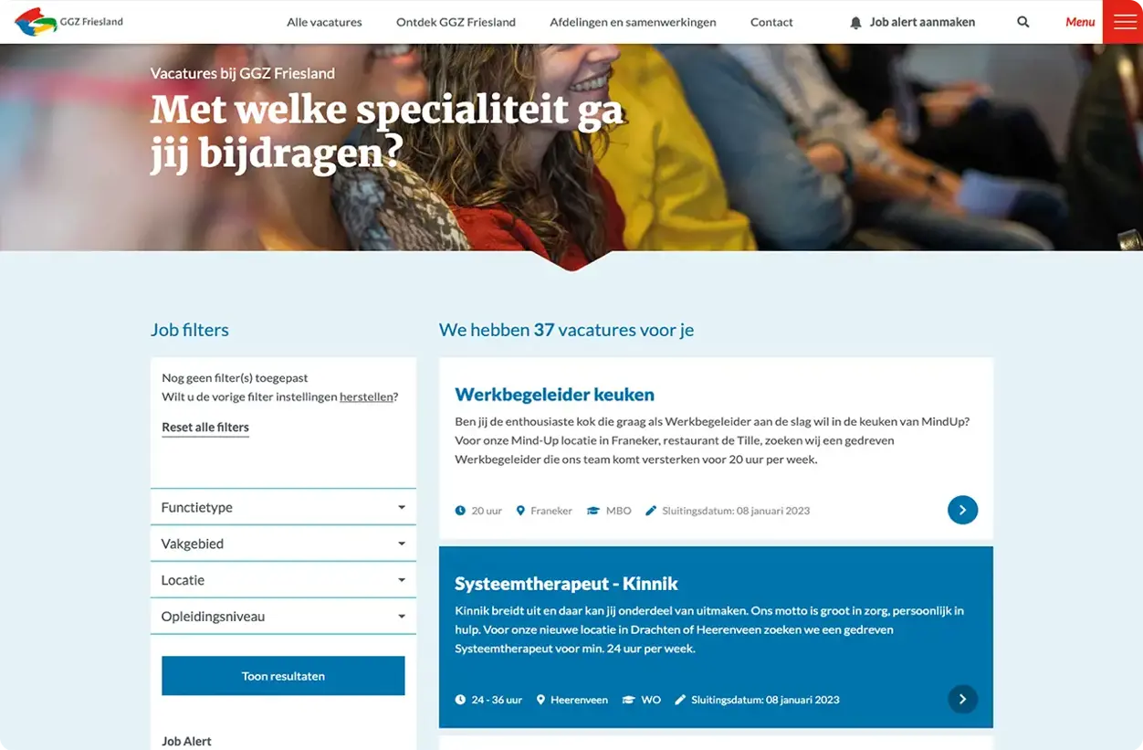 Slimme filteropties en zoekfunctie: Bezoekers kunnen eenvoudig door het vacatureaanbod navigeren met behulp van slimme filters en zoekmogelijkheden.