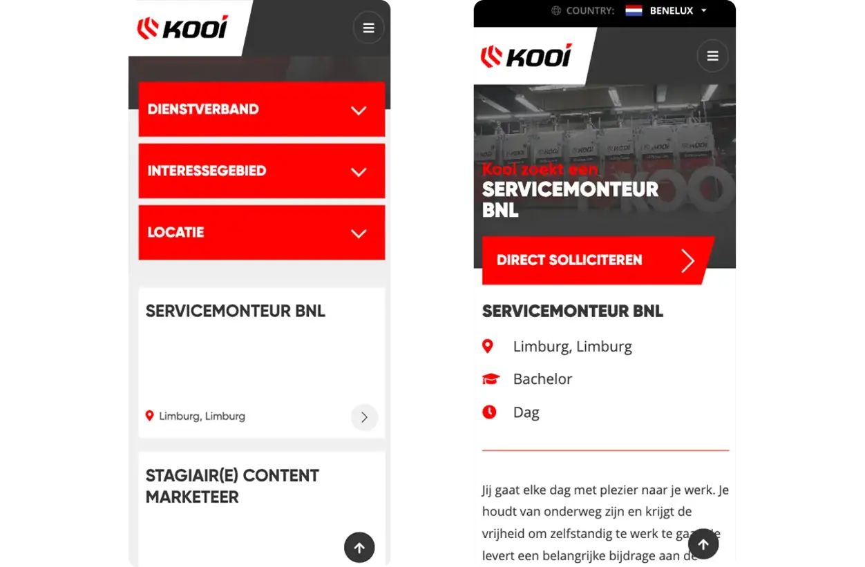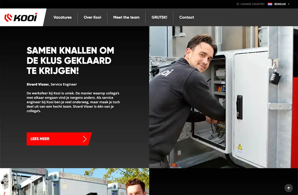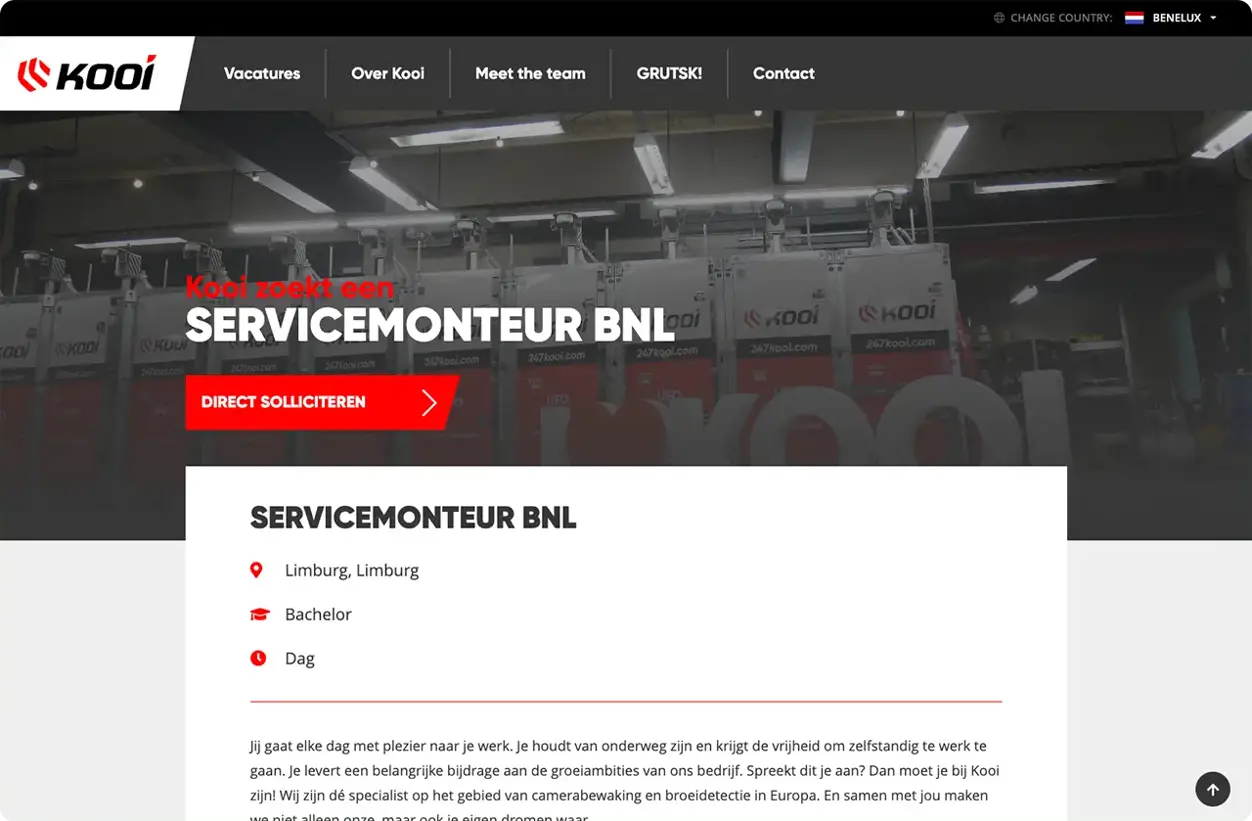 Speak realiseerde de werken-bij website op basis van het professionele en gebruiksvriendelijke Umbraco CMS. Tevens is er een koppeling met Visma EasyCruit gerealiseerd, waardoor vacatures en sollicitaties op één centrale plek worden beheerd en afgehandeld. Vanuit Visma EasyCruit worden vacatures automatisch doorgezet naar alle internationale werken-bij websites en worden sollicitaties via de websites automatisch doorgezet naar Visma EasyCruit. Dit werkt efficiënt en buitengewoon prettig voor de HR-afdeling van Kooi.