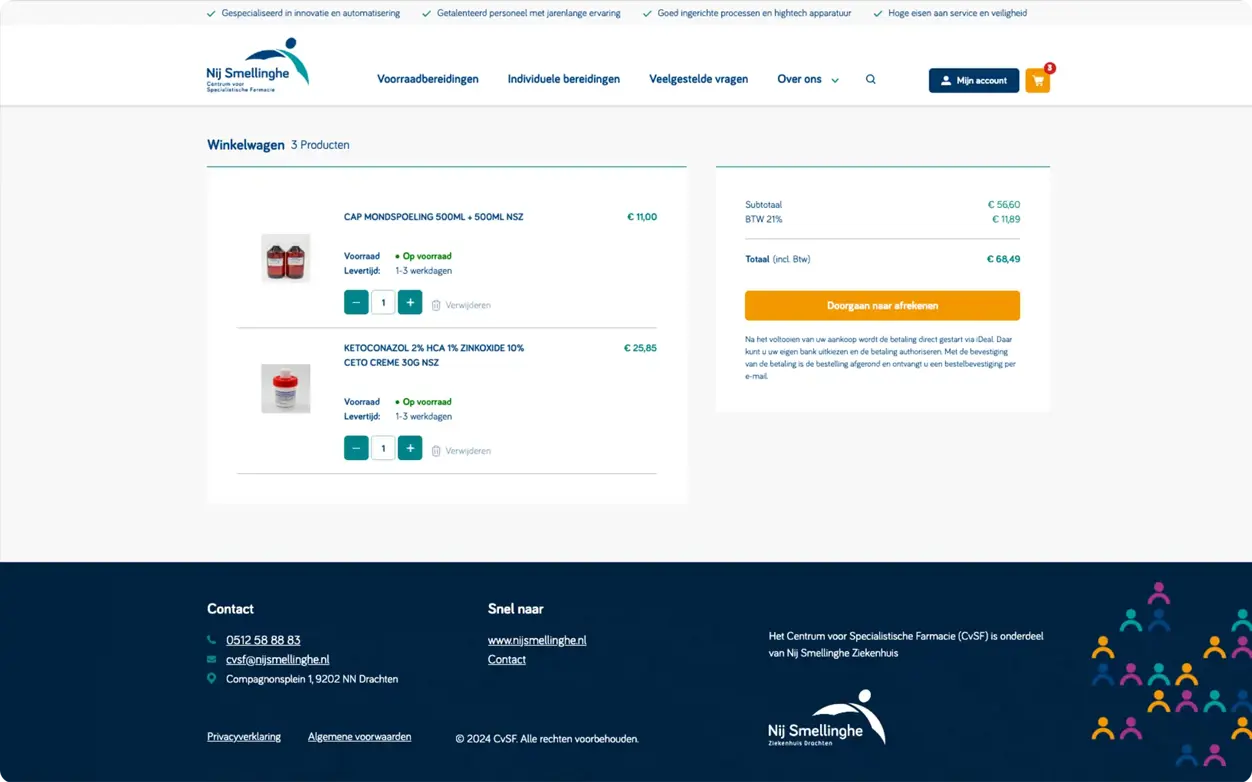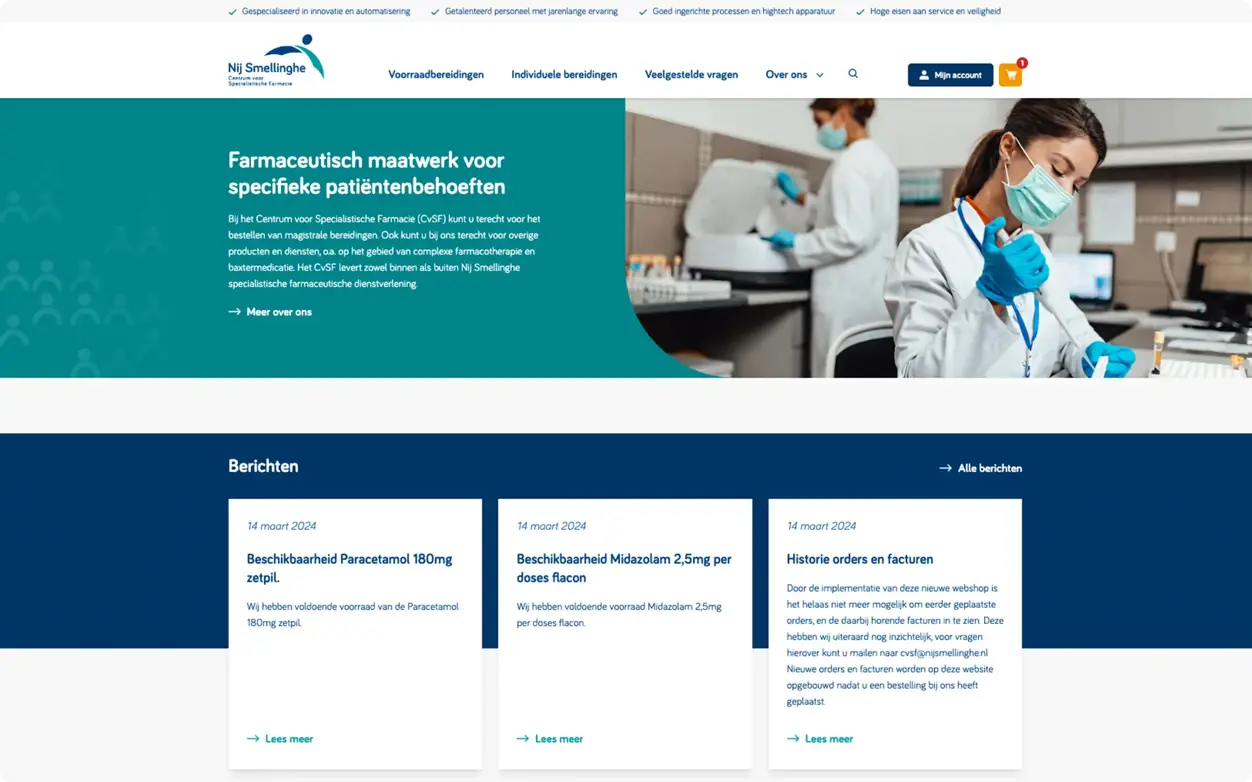 Ontwikkelen van de webshop voor Centrum voor Specialistische Farmacie (CvSF), onderdeel van Ziekenhuis Nij Smellinghe met een snelle, gebruiksvriendelijkere en veiligere online ervaring die voldoet aan de meest recente beveiligingsnormen.